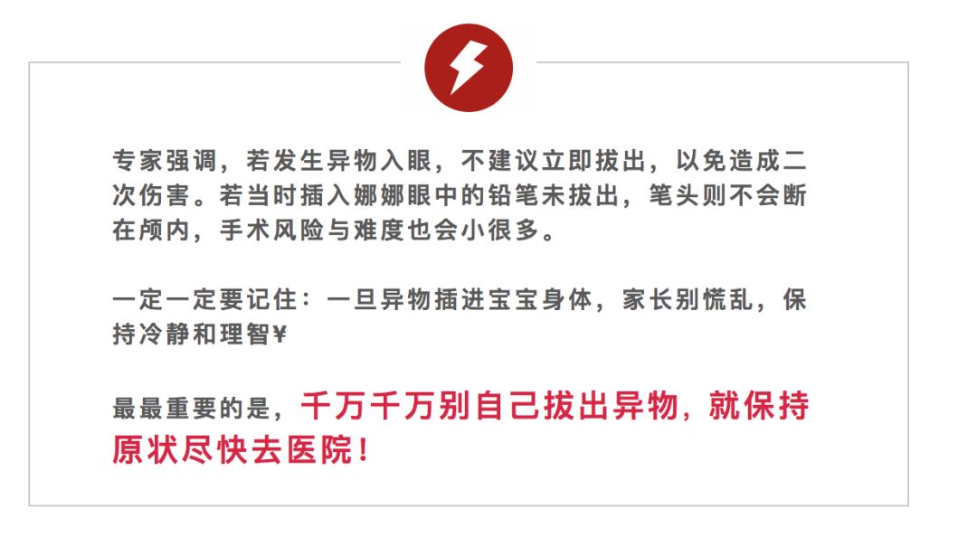 原来,一截铅笔正插在娜娜的眼睛上缘, 从右眼眼眶眉中部位直刺入眼, 妈妈吓得手足无措,没有多想,顺手就把铅笔给拔了出来。