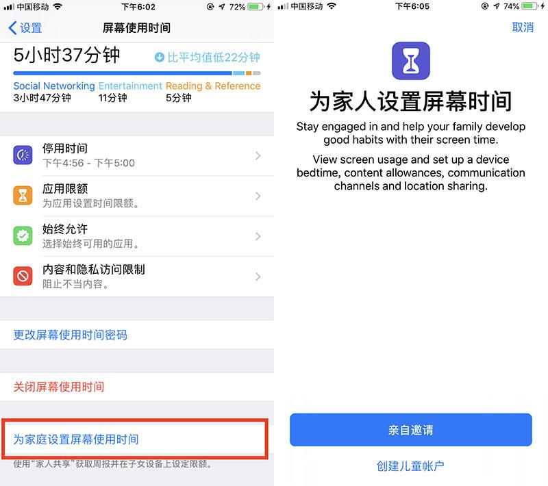 现在,苹果在屏幕使用时间里也引入了这一理念,管理个人手机使用的同时,也让你管理子女等家庭成员的使用时间,随时设置游戏、社交媒体的时间限额,有效防止沉迷手机玩乐。