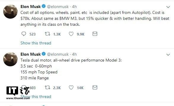 5月20日消息,特斯拉CEO马斯克在推特上曝光了全新的Model 3汽车,称新款汽车将会在细节上有所变化,同时更加经济。马斯克表示全新的Model 3汽车将于今年7月正式交付。他表示,Model 3的0-60英里/小时(约合96公里/小时)加速时间为3.5秒,最高速度155英里/小时(约合249公里/小时),续航为310英里(约合500公里);双电机全轮驱动版本的Model 3汽车售价78000美元(约合49.7万人民币),和宝马 M3汽车相当,但是速度快了大约15%,操纵性也更加出色。