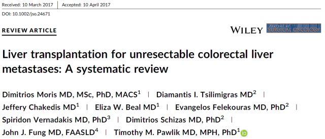 针对肝门胆管细胞癌如何筛选合适的病人进行肝移植,到底是手术切除还是肝移植更好,移植前的最佳治疗方案是什么,相信这些问题还会争论很久。但是这个讲座让我最大的收益就是Mayo Clinic在肝门胆管细胞癌的治疗上不是仅选择传统的手术切除、放疗、化疗三*法大**宝,而是Think out of the box,在综合治疗的基础上选择了更为激进的肝移植治疗。而且,的确我们看到在过去的25年中,一部分病人是从肝移植的治疗中获得了长期生存。那么,如果顺着这个思路想下去,针对结直肠癌仅伴单纯肝转移的患者,是否也可以考虑肝移植呢。Pubmed查了一下其实,2017年Moris的一篇系统回顾正好总结了过去30年结直肠癌伴不可切除肝转移接受肝移植的情况。