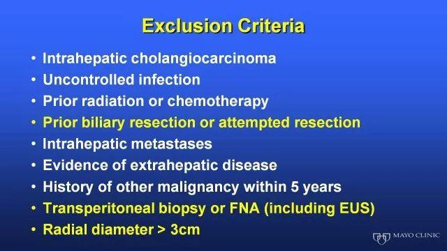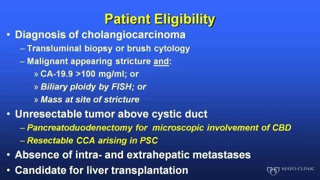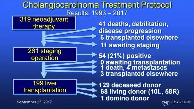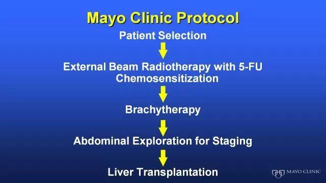 由于肝源有限和胆管细胞癌整体预后差,Rosen教授所在的Mayo Clinic也设定如果肝移植后肝外胆管细胞癌患者的5年生存率可以达到50%左右,那么肝移植这个治疗策略无论从医学价值还是社会经济学价值都是可以接受的。如何能保证进行肝移植的患者有长期生存可能,移植前的综合治疗也是非常非常重要的。Mayo Clinic筛选病人后,患者要先接受氟尿嘧啶为基础的同步放化疗,然后再行局部粒子植入。在局部控制非常好的前提下,进行腹腔探查分期,如果无远处转移,即可进行肝移植。