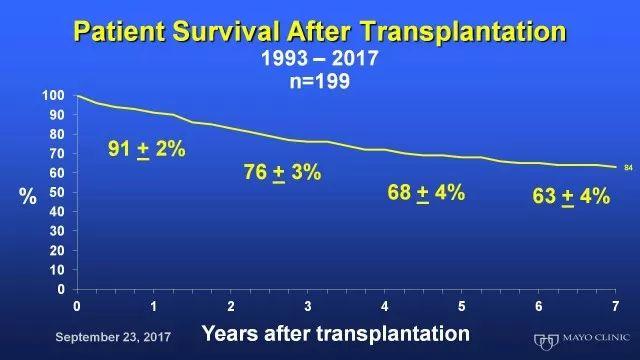 那么有多少患者可以最终走到肝移植这一步呢?按照Mayo Clinic入排标准筛选后的病人在1993-2017年总共319名,最后199位患者顺利地接受了肝移植。也就是2/3的患者走到了最后这一步。