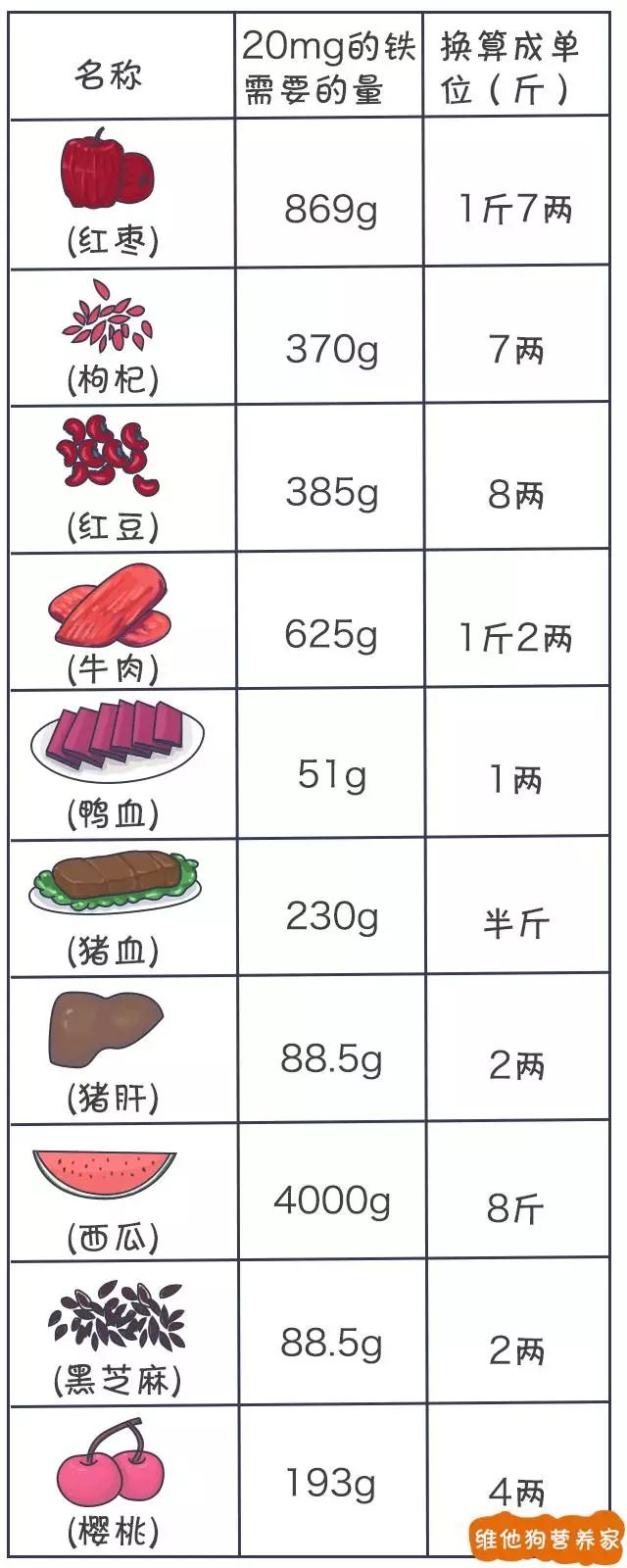 中国居民膳食指南推荐,18~50岁女性铁摄入量为20mg/日,这张补铁的食物表,大家赶紧收藏起来吧↓↓