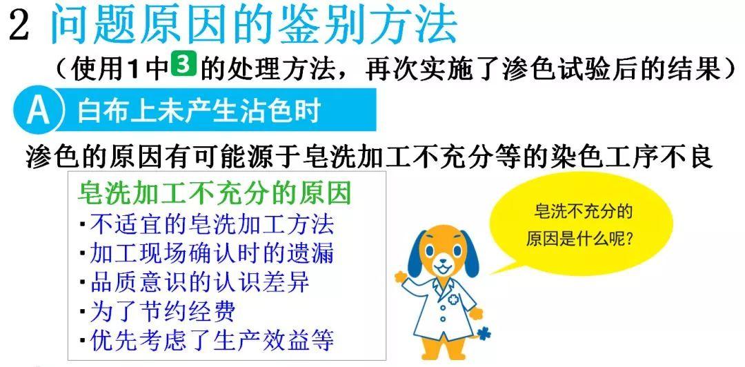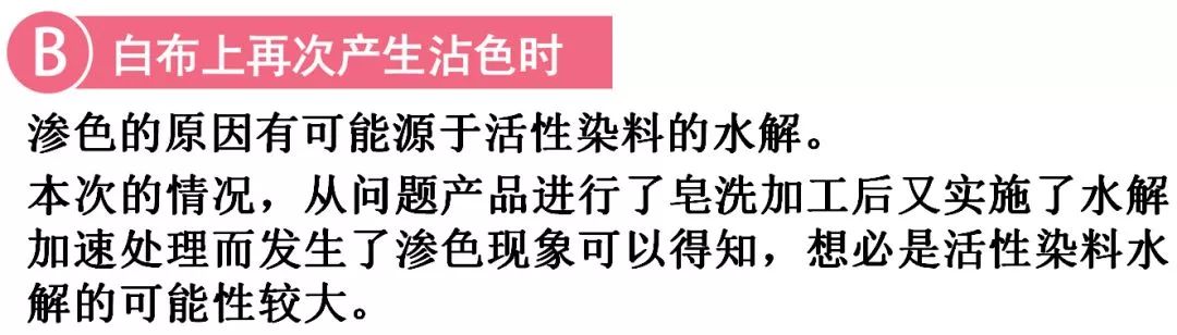 深浅搭配(包括白色)的面料上,深色部位的染料流向浅色部位或白色部位,发生沾色的现象叫作渗色。问题发生的原因有下述A和B两种可能性,针对渗色问题如无法使用新品进行再现试验,可以按照下述的顺序在某种程度上推测出原因所在。