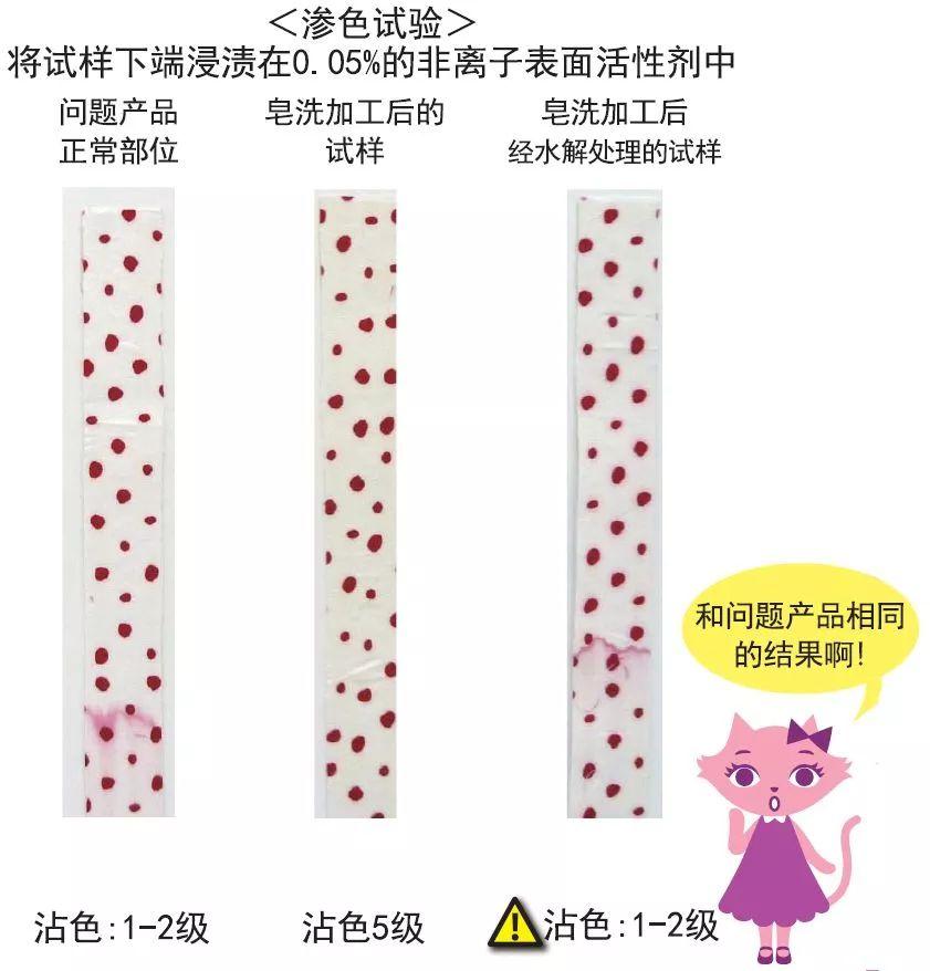 问题发生状况 洗涤时,印花的点点图案部位发生了渗色现象。