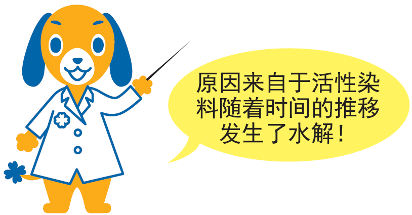 原因 因印花加工所使用的活性染料会随着时间的推移发生水解,所以在洗涤时的水分影响下发生了渗色。