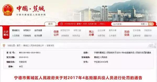 近日,福建省宁德市蕉城区人民政府发布了关于对2017年4名拒服兵役人员的处罚通告,其中每人罚款人民币五万元整,户籍栏注明“拒服兵役”。