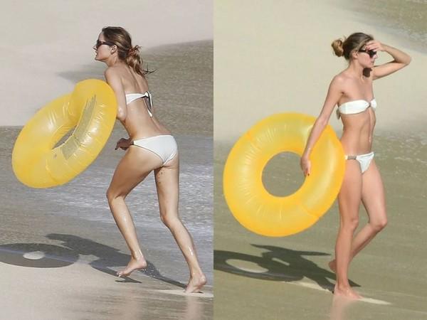 先来看一个反面例子。Olivia Palermo属于平板身材,或许背后看起来还是美的。但转过来……胸小真的撑不住这种抹胸式Bikini啊。
