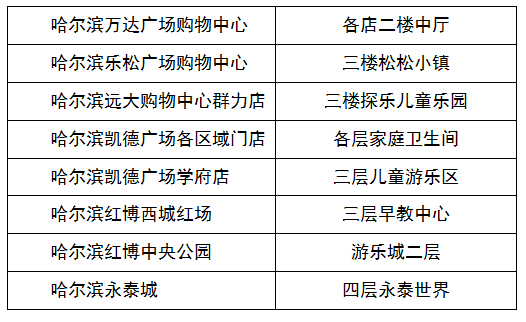 同样哈尔滨红博西城红场、哈尔滨红博中央公园、永泰城等地均有早教中心哺乳间,为哺乳期女性营造更好的哺乳环境。
