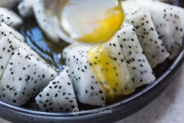 那么冰好,切块,浇上甘草梅汁,神反转来得如此简单。卤汁的酸甜咸,增加层次感,把平平无奇的火龙果点化得特别有趣!