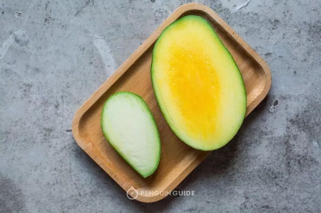 越生越适合做甘草水果。生到什么程度?跟常见青芒切开对比,就知道了。