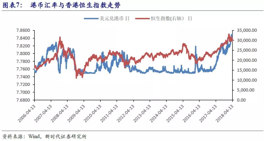 香港流动性充足,并且在持续流入股市。目前恒生指数的市盈率为11倍左右,恒生国企指数市盈率不到10倍,处于历史较低水平,同时成分股大多为事迹稳定的蓝筹企业,香港股市的吸引力仍在,不会出现恐慌式的崩盘,导致股汇双杀,形成股市下跌、汇率贬值的恶性循环。从2008年次贷危机时的情况看,即便当年恒生指数遭遇重挫,港币贬值幅度依然可控。香港金管局已多次公开表示一旦港币触及7.85弱方兑换保证将入市干预,此次触及弱方兑换保证香港金管局也即刻出手。此外,截至2018年3月底,香港政府拥有4403亿美元的外汇储备,入市干预汇率的能力和意愿都不容置疑。因此,此轮港币汇率下跌对股市的影响相对有限。