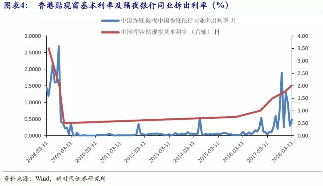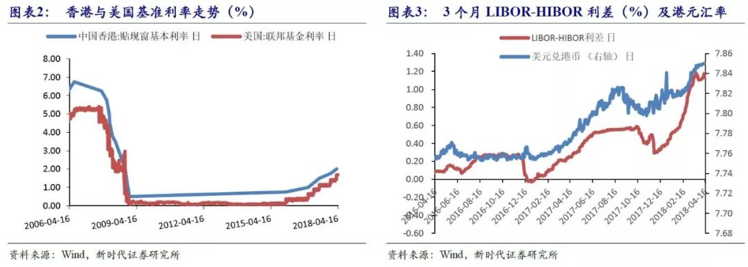 2015年12月美国开始新一轮加息周期,香港金管局为了避免资本外流、港币贬值,几乎每次均跟随美联储加息。美联储3月22日宣布加息25BP后,香港金管局也随即上调隔夜基准利率25BP至2.0%。但是影响汇率的是市场利差,并不是基准利差。目前3个月的LIBOR利率已超过2.34%,远高于联邦基金利率,而且延续以较快速度上升的态势。