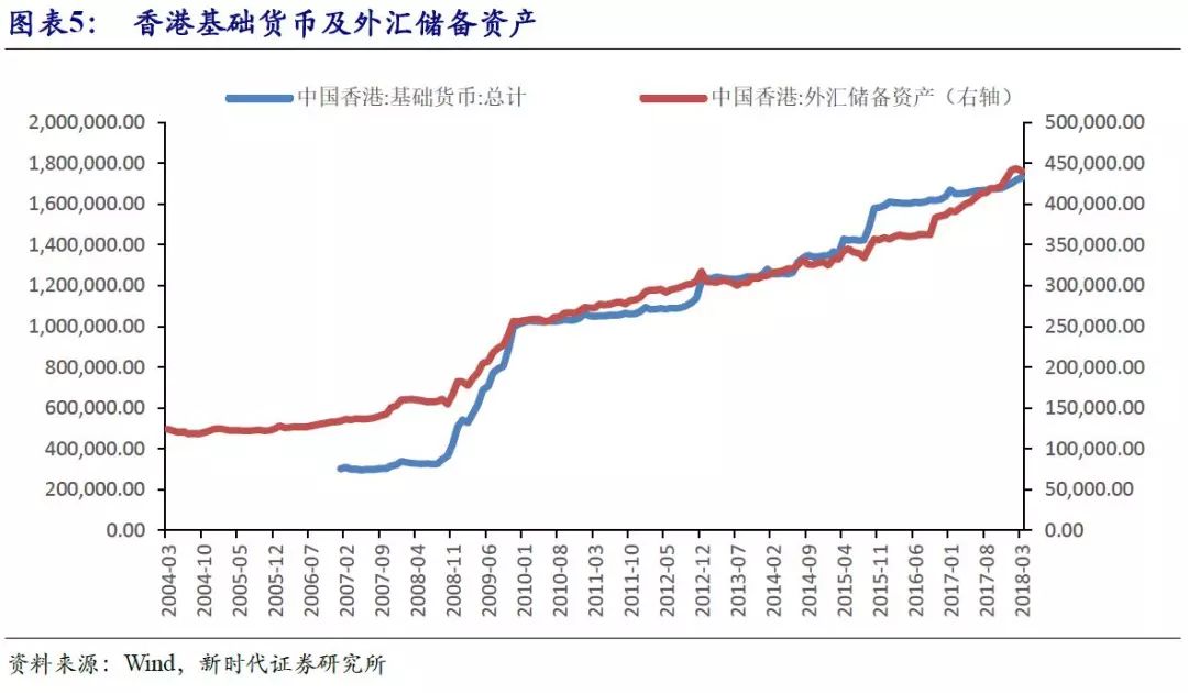 2008年金融危机之后,各国相继出台货币宽松政策,流动性泛滥,香港股市和房市吸引大量资金流入,当然也包括中国内地资金。一方面,随着内地居民财富的增长,海外资产投资需求增加,另一方面,中国近几年增速降落,投资机会减少,大量资金流向香港寻找投资机会。特别是8.11汇改之后,人民币贬值压力增加,内地投资者投资香港资产的动机更加强烈,大量资本从内地流入香港。目前除了美国外,其他主要国家货币政策正常化仍没有跨出实质性的一步,全球流动性依然充沛。香港外汇储备从2008年初的1527亿美元上升到2018年3月的4403亿美元,同时,基础货币也被迫从3205亿港元增加到1.73万亿港元,这就造成了港元供给过剩。