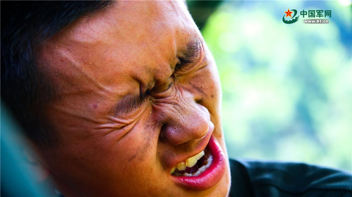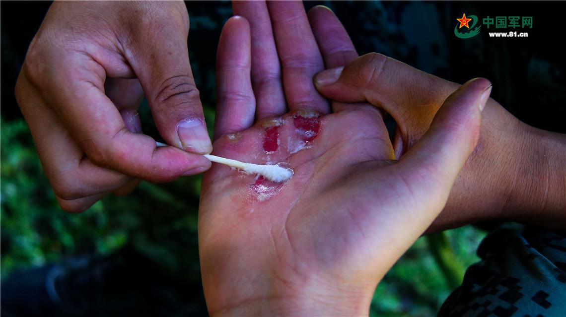 处理伤口时的上等兵林康强忍着疼痛。