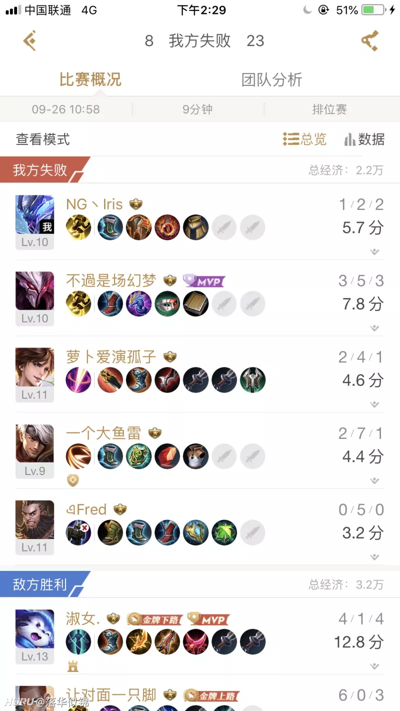 有一局我玩干将,对面选了一个鲁班+王昭君,我特别高兴,这两个都是靶子,随便戳。结果那一局我就犯了一个很严重的错误,每次我们队友集结打算打团了,我就兴冲冲的上去丢个大招,刷刷刷塔里的鲁班剩血皮,然后他们全部撤退不打了,鲁班回去吸血了,我们错过了好几波开团机会。那一局虽然我输出打到了37%,但本来大顺风的局硬是拖到了二十多分钟。这个例子说明什么呢,5v5的团战的时候,除非你有信心能一套直接秒掉对面脆皮,否则不要在队友跟不上的时候把技能全放掉了,这样的话,你打的输出就全部都是无效的。但很多人意识不到这一点,打输出不等于carry,你和久诚一样打40%的输出,他打到是什么,你打的是什么,自己想想,就知道差距了。