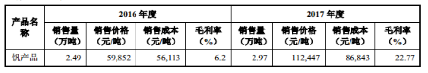 *ST钒钛此言非虚,2017年钢铁企业的盈利确实突飞猛进,例如,八一钢铁(600581)2017年盈利11.68亿元,同比大幅增长3047.86%;包钢股份(600010)净利润20.61亿元,同比增长2324.05%;方大特钢(600507)2017年盈利25.4亿元,同比增幅达281.4%。所以*ST钒钛单就钒产品的毛利率,在2017年就较2016年增加了16.52个百分点。