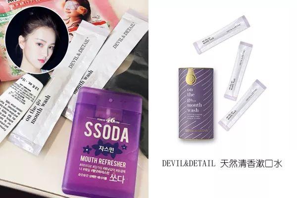 除了孙怡晒出来的一些口气清新剂,其实漱口水也是个不错的选择。黄灿灿有推荐DEVIL&DETAIL这个牌子的漱口水,它比较好的地方是有这种独立的小包装,平常放在包包里也不占地儿,这个牌子的漱口水添加了大马士革玫瑰精油,能消除口腔中的异味,还能起到杀菌的作用,一举两得。