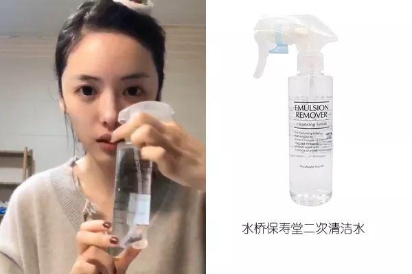 蔡文静在用的这个喷雾挺神奇的,是水桥保寿堂二次清洁水,无色无味,但是可以对油分起到一个乳化的作用,洗完脸后喷在皮肤上会变成白色的液体滴下来;咱们的黑头也是毛孔中油脂污垢所形成的,所以它还具有抑制黑头的作用。