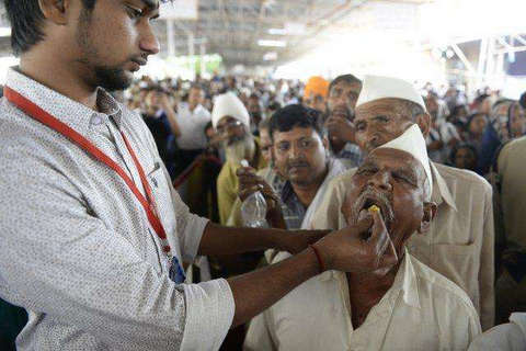 印度海得拉巴,哮喘病患者接受传统“鱼疗”。每年都有数千哮喘病患者聚集到海得拉巴,在这里接受一种奇特的“鱼疗”。