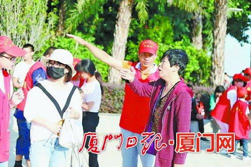 在厦门旅游集散服务中心思明区曾厝垵服务点,面对游客抛来的一个个问题,身穿红马甲的思明旅游志愿者张艺韬耐心回答,“忙得都没时间喝水了,但是看着游客带着满意的笑容离开,很开心。”