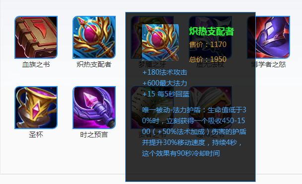 在拥有了三件套之后,扁鹊可以考虑提高一下自己的生存能力了。【炽热支配者】这件装备,给扁鹊提供了600点的额外法力值(频繁使用1技能的扁鹊是很缺蓝的),此外,它的被动效果护盾加移速,可谓是保命神技了。一个拥有三件套和支配者的扁鹊,按照1级英雄来算,护盾值为450+0.5(140+240*2+180)=850点,要知道同等态势下魔女斗篷才只能提供320点的法术护盾,而30%移速加成更是让扁鹊拥有了105点的额外移动速度。