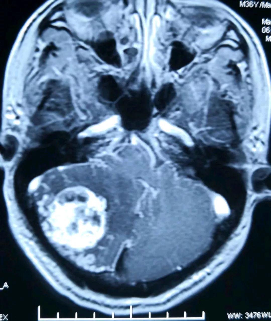 另一位置的增强磁共振提示肿瘤长向小脑深部,靠近脑干组织(人的生命中枢)