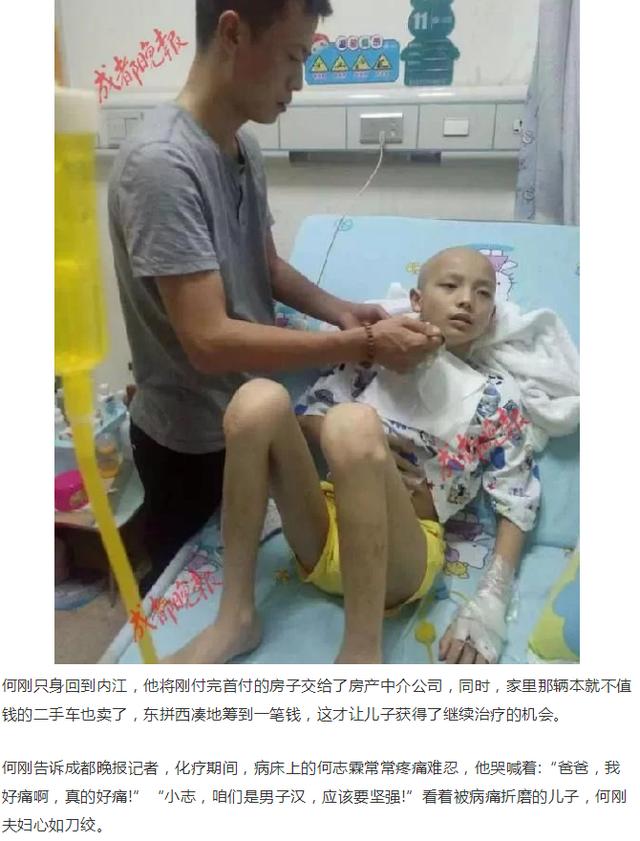 5月23日,父亲何刚在内江街头为儿子筹集看病钱的路上,晕倒在街头,路人把他送到医院救治清醒后,连声说了谢谢,不顾医生的劝阻执意“逃离”了医院赶往成都,因为他要去成都去筹钱给还在病床上扛争的儿子治病救命。