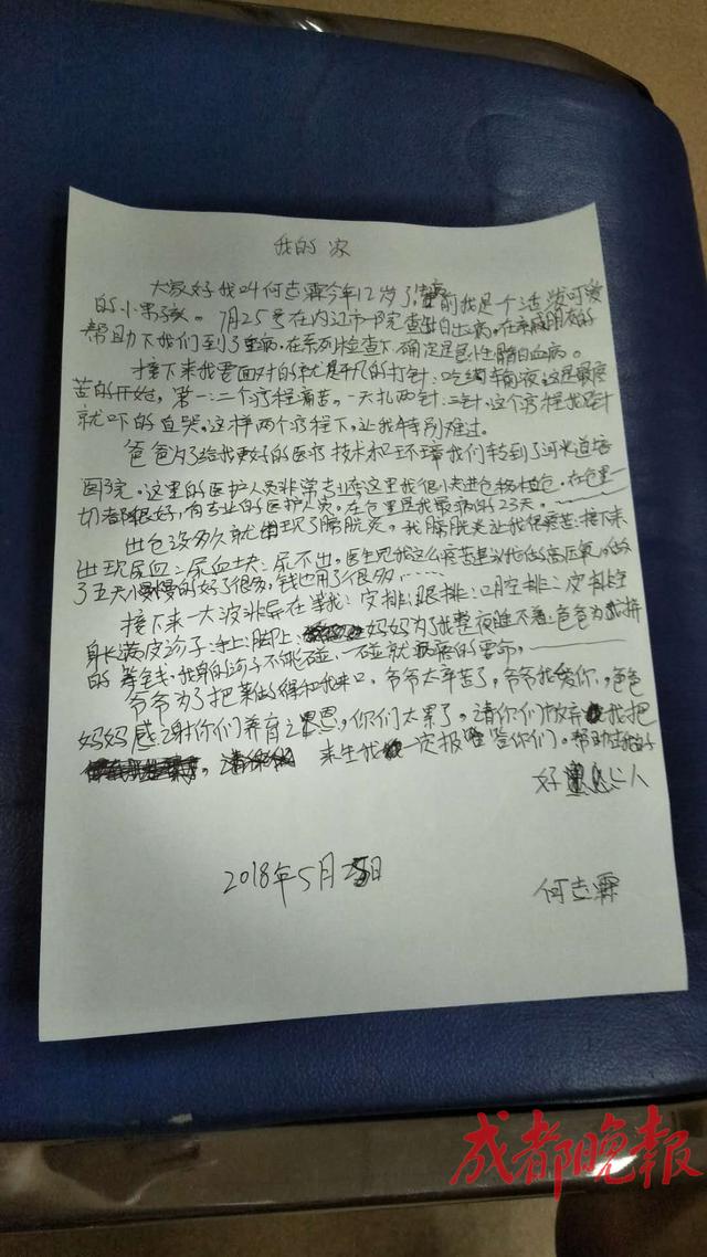 近日,志霖的妈妈在他的日记上再一次发现了一封信,“爷爷,我爱您,爸爸妈妈,感谢你们的养育之恩,你们太累了,请放弃我吧,来生我一定会报答你们、报答帮助过我的人。”日记显示是志霖在5月25日写下的,“志霖很喜欢写日记,不知道这篇日记是他什么时候写的,只是今天锻炼完后,我才发现…”志霖的妈妈几度痛哭地告诉成都晚报记者:“求求大家,救救我的孩子!我们夫妇愿用一生来回报好心的你们。”