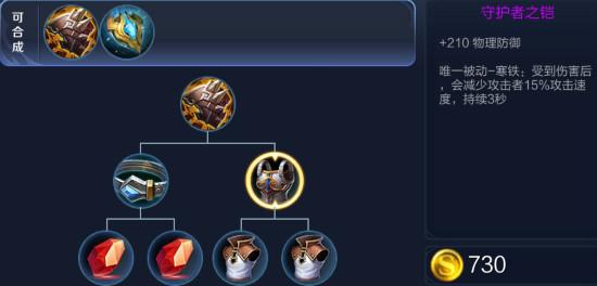 很多坦克战士都会出的防御装,对付射手效果显著。合成路径是守护者之铠+腰带,守护者之铠是一个性价比很高的小件,减对方的攻速,也有一定护甲,建议先购买(特别是上单对线射手,影忍之足+守护者之铠,基本就打不动啦)