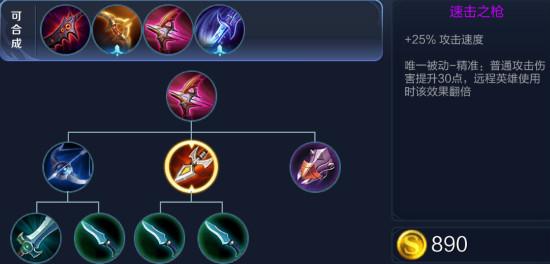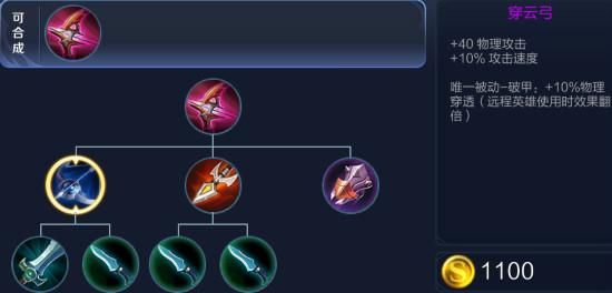 方式:前中期可以先购买穿云弓,到了后期再合成破晓大件。没有格子时,下一个小件优先选择速击之枪,性价比更好。