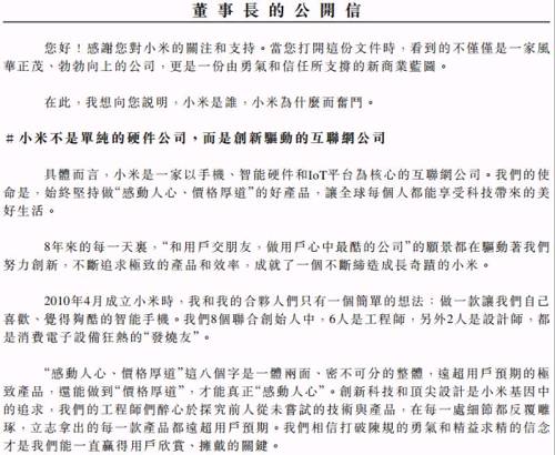 在招股说明书中,雷军发表了公开信,公开信有着浓浓的“互联网情怀”,他提到“我们的*途征**是星辰大海,小米未来将成为全球几十亿人生活中的一部分,并称厚道的人运气不会太差。”并表示,“我们会更看重长期用户价值的维护,小米的商业价值和您的投资价值,也将来源且仅来源于用户价值的不断放大实现。小米走到了历史性的重要节点。面向未来,小米建立的全球化商业生态有着极具想象力的远大前景。”