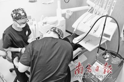 9月6日上午10点,在汕头口腔中心二楼综合科诊室里,一名30来岁的女性患者刚签好知情同意书,随后躺在牙椅上接受治疗。彭烨斌为该患者的主治医生,他正在“摆弄”一台通体红色的仪器,设置一系列参数。原来,该仪器就是美国BIOLASE水激光治疗仪。
