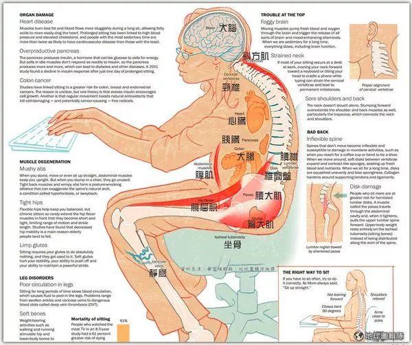 在现今的社会,我们每日在电脑前都要坐8~10个小时,这样始终是在髋关节屈曲态势,所以我们的髋屈肌和大腿前侧的股直肌不断的维持着一个收缩的态势,而下背部处于长期的向后突出、受弯的态势。
