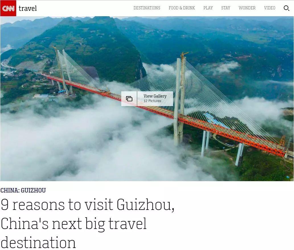 (2)5月7日,美国有线电视新闻网(CNN)推出报道——《9 reasons to visit Guizhou,China's next big travel destination》(去贵州的9个理由,中国下一个大旅游目的地),这让全球的旅游爱好者心向往之,贵州旅游产业这张靓丽的名片再次“霸气侧漏”,夺得世界眼球。