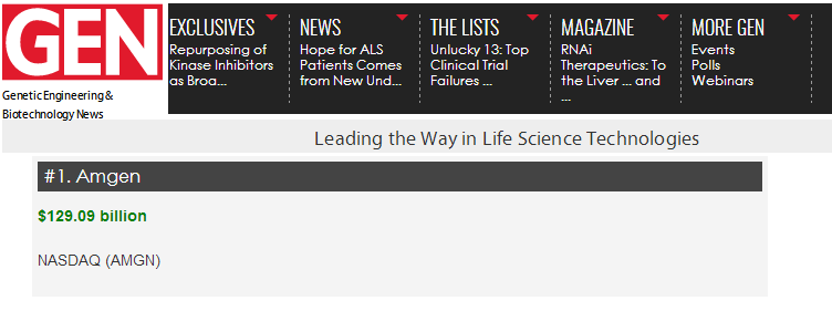 日前,生物技术杂志《基因工程与生物技术新闻》在其网站发布“Top 25 Biotech Companies of 2017”榜单,安进以 129.09 亿美元的市值再次稳居第一。