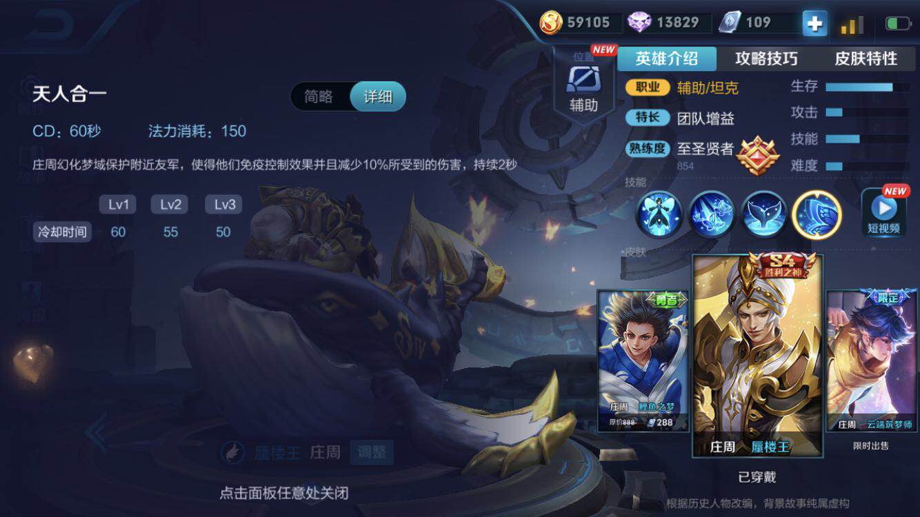 而且庄周的大招除了可以让队友增加10%免伤效果外,还可以让队友解除控制并在2秒内免疫控制,是打团时的增益神技。