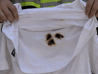 但是几分钟之后,衣服上也出现了黄色区域,并逐渐变黑。