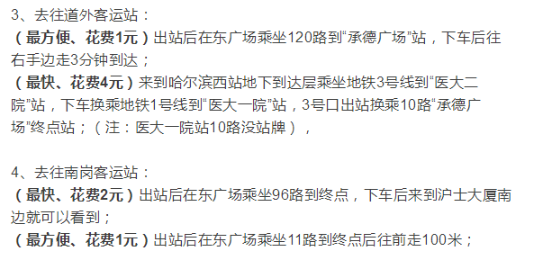 (最方便,花费1元)承德街不过道乘坐4路到“哈东站”站,下车后沿着前进方向走到北棵街,往右走5分钟到达站前广场;