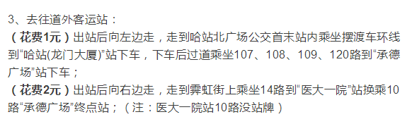(花费1元)承德街过道,穿过建筑物来到景阳街上,过道乘坐107、108、109、120路哈站站,然后换乘摆渡车环线到哈站北广场;