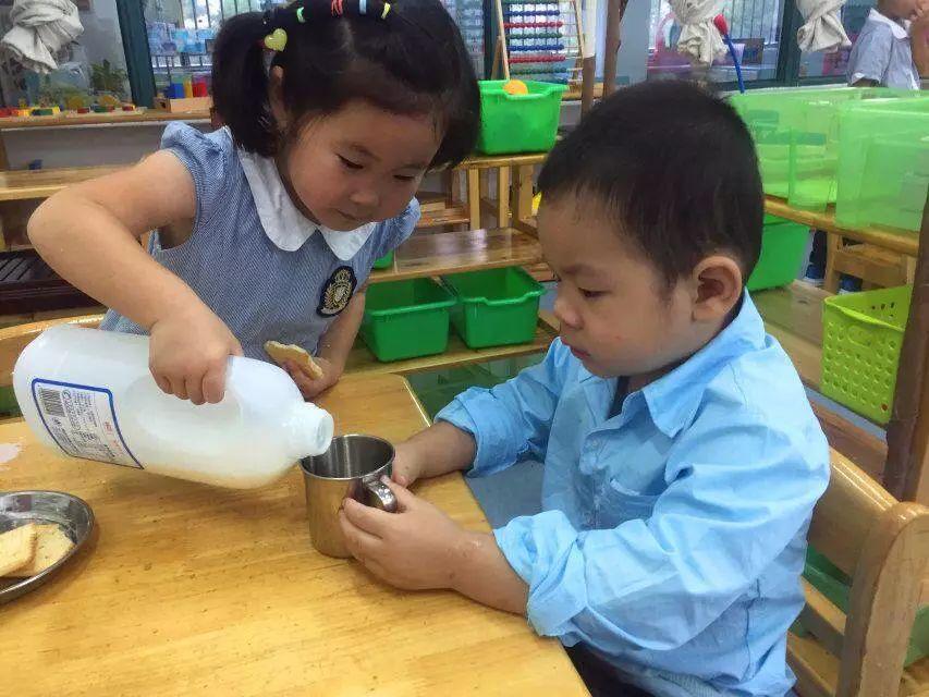 南师附中江宁分校幼儿园,有一种“绿色生态”教育体系——混龄课程。在这里,没有按照年段将孩子们分开,所有3-6岁的幼儿,自然的融合在一起,组成一个大家庭,他们是家庭中的兄弟姐妹。他们之间彼此模仿、学习、交流、探讨,常常看到哥哥姐姐教弟弟妹妹进行蒙氏工作、穿脱和叠放衣物、吃饭、坐端正等等的行为;和弟弟妹妹共同合作游戏、手拉手室外散步的身影……孩子的年龄差异和发展水平、发展速度以及发展特点匹配起来,在“家庭”内部形成具有层次的“最近发展区”。