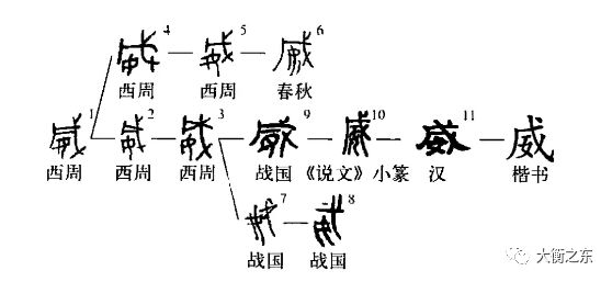 这是“威振天下”的“威”字。是个会意兼形声的字。①是金文的形体,右边是一把类似长柄大斧的*器武**,左下角是一个女人,即表示“施威”之意。“戊”也表声。②是小篆的形体。③为楷书的写法。