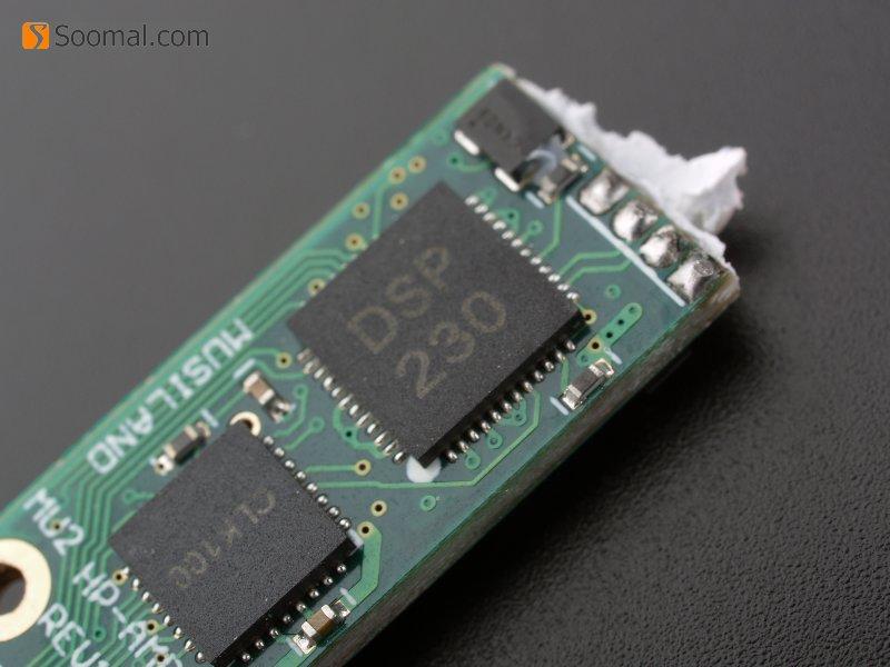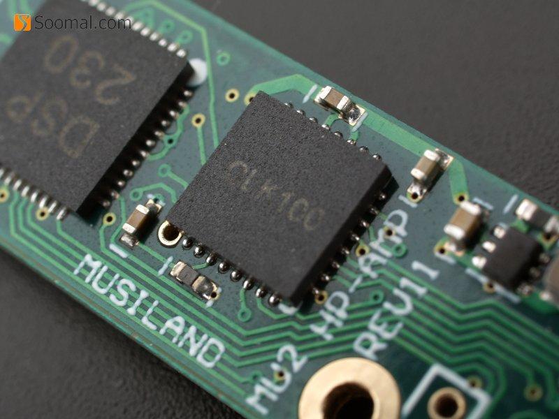 MU2采用乐之邦自研的SuperDSP230音频控制器,支持44.1、48、88.2、96、176.4、192、352.8、384kHz/16、24、32Bit的采样规格。主板上有三颗芯片,中间那颗标记着CLK100的,是SuperCLK100,这颗芯片用于生成44.1kHz/48kHz及其倍频的时钟,官方说法是精度可达2PS。