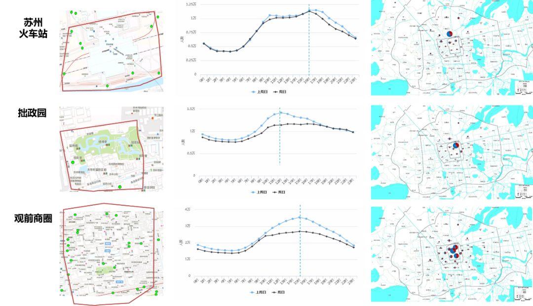 选取苏州观前商圈、拙政园景区、苏州火车站等热点区域,了解客流规模特征。