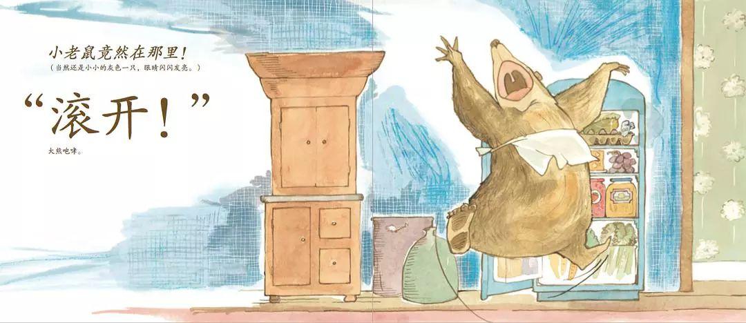 面对大熊的驱逐,小老鼠总是眨巴着眼睛,看着大熊:可我只是想要和你一起吃块奶酪,喝杯茶。