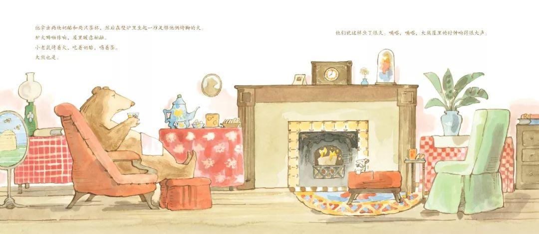 大熊一次次给小老鼠添上茶。直到小老鼠起身离开,说:“我要走了。”