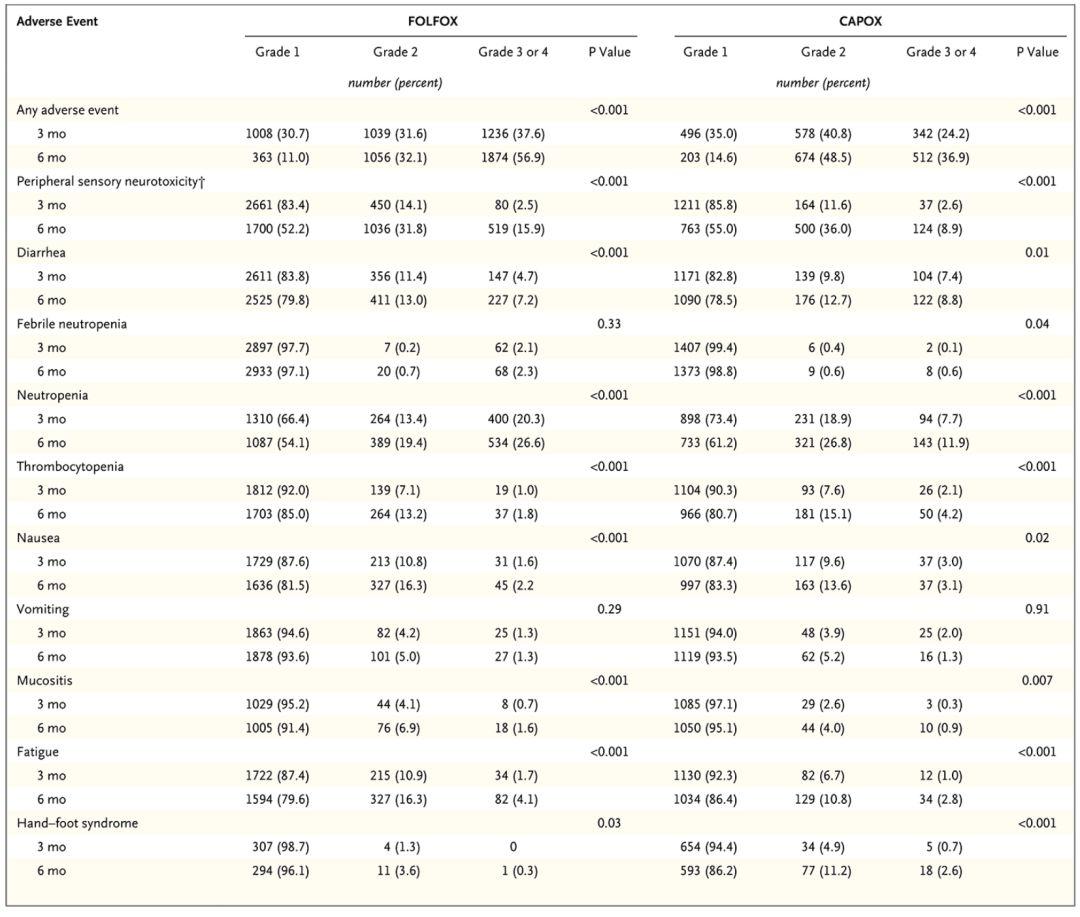 在3个月治疗组中,不论是FOLFOX方案,还是CAPOX方案,其2级以上神经毒性反应发生率均明显低于6个月治疗组(16.6% vs 47.7%, 14.2% vs 44.9%)。