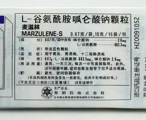 麦滋林(L谷氨酰胺呱仑酸钠颗粒),为略带浅蓝色的颗粒剂,用于胃炎、胃溃疡和十二指肠溃疡。一般一天三次,一次一包口服。