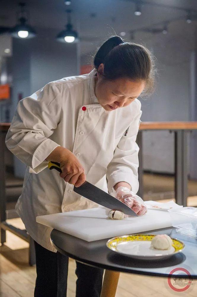 陈六梅师傅在将点心改刀成小块