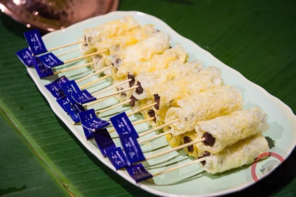 现场制作的红豆沙乳扇卷非常受女性喜欢。云南当地人将牛奶煮好后,将最上面的一层油脂挑出来,扯成片,晒在竹竿上,得到的就是乳扇,一般油炸后食用。红豆沙乳扇卷在乳扇中卷入餐厅自制的红豆沙,再入油炸制,香甜可口,外酥里糯。